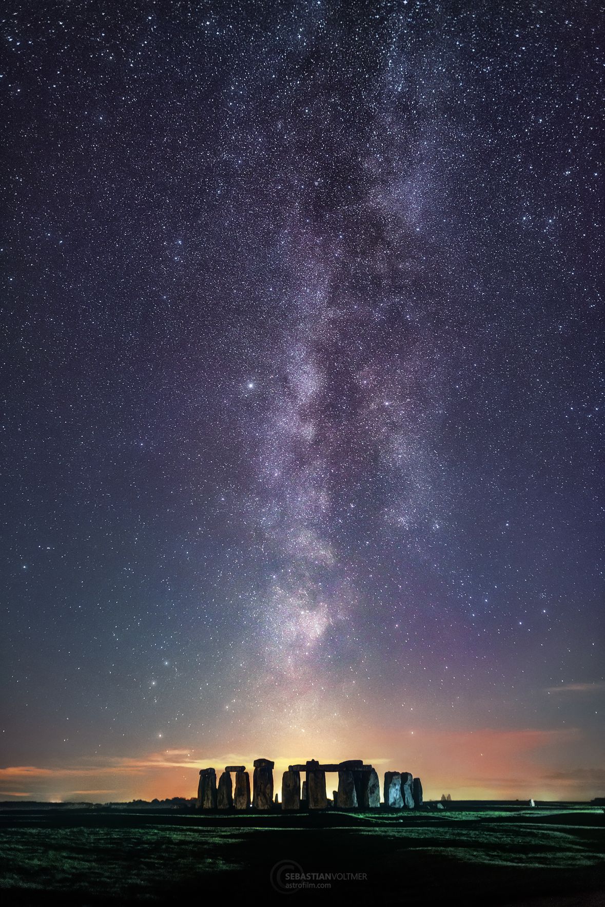 Milky Way and the Summer Triangle over Stonehenge. In the early evening I walked to the monumental stones of Stonehenge. As the sun slowly disappeared behind the stones, I set up my photo equipment. The weather was changeable. But just in time after the blue hour, the sky cleared up and the Milky Way become visible, which rose from my position on Heel Stone just above the epic stone circle of Stonehenge.