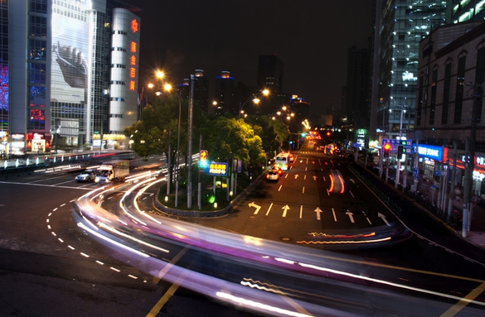 I took this photograph atop one of the sky bridges overlooking Shanghai's Xujiahui. The image shows how economic growth in China has impacted urban districts within the country. In order to get a long exposure of the bus passing by, I used the ledge of the bridge along with a Targus Grypton tripod. Only some contrast and sharpness was added in Photoshop.
