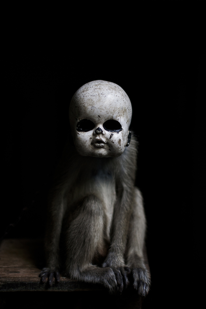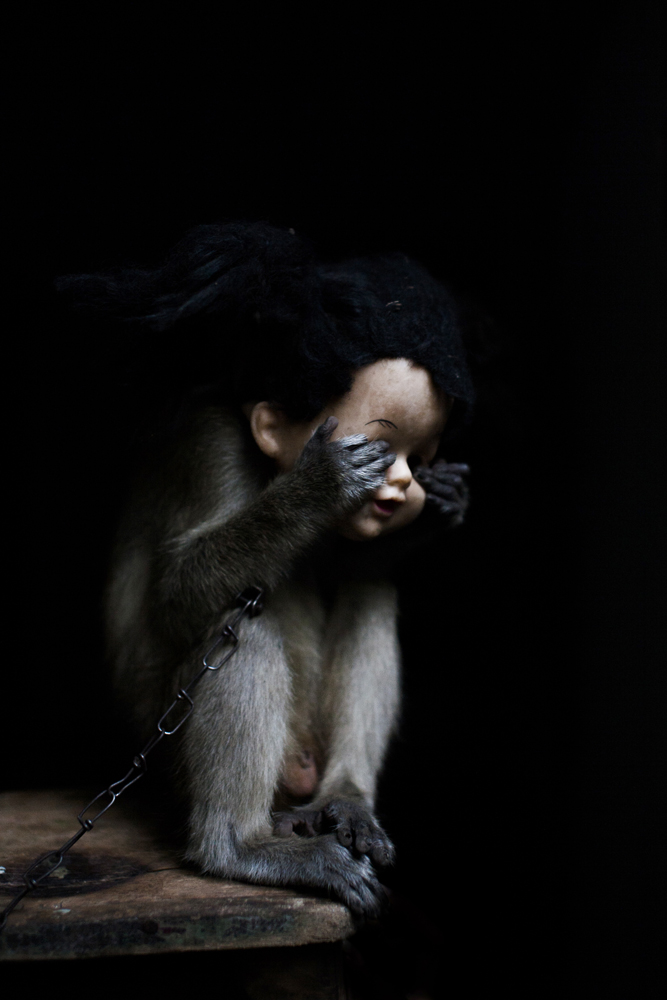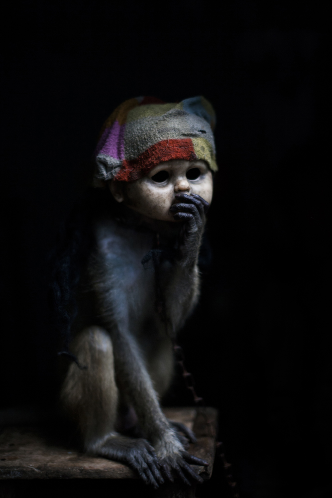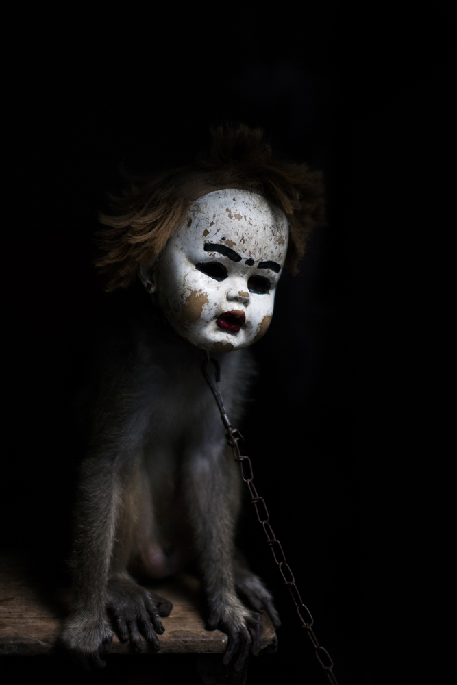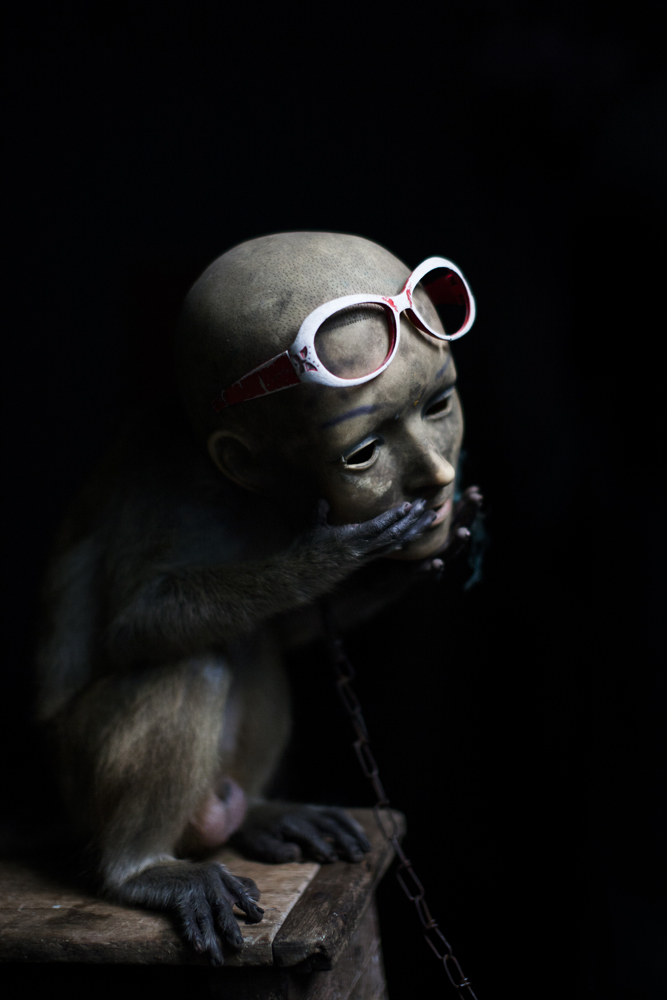Topeng Monyet is a project focused on Indonesian monkey theatre. It is a street performance, during which a trained monkey does acrobatics, like riding a motorbike, using a toy phone to make calls, imitating soldiers activities, i.e. saluting. The animals wear masks made from old dolls and behave like a human beings during the performances. Their audience consists mostly from children who laugh and touch them during a show. After 5 years monkeys are retired. They will be tied to a tree nearby a house of their handler. However, many monkeys will die before this age because of exhaustion. A positive breakthrough happened in January 2014 when big Indonesian cities (e.g. Jakarta and Bandung) banned this kind of entertainment. It has been imposed after protests of animal rights organizations. The photographs show monkeys with stage masks on. The pictures were taken in Surabaya, where the ban does not apply yet.
