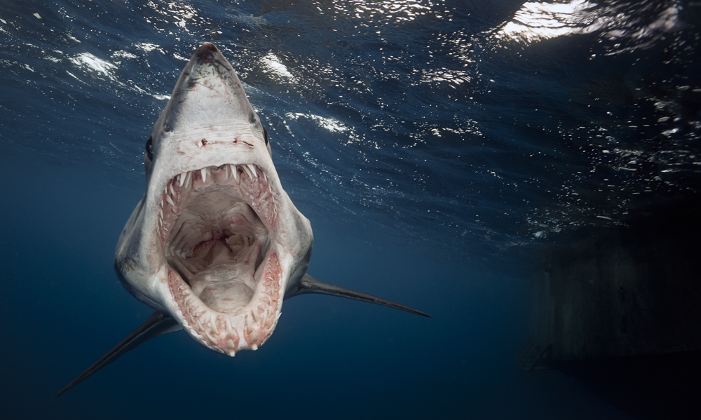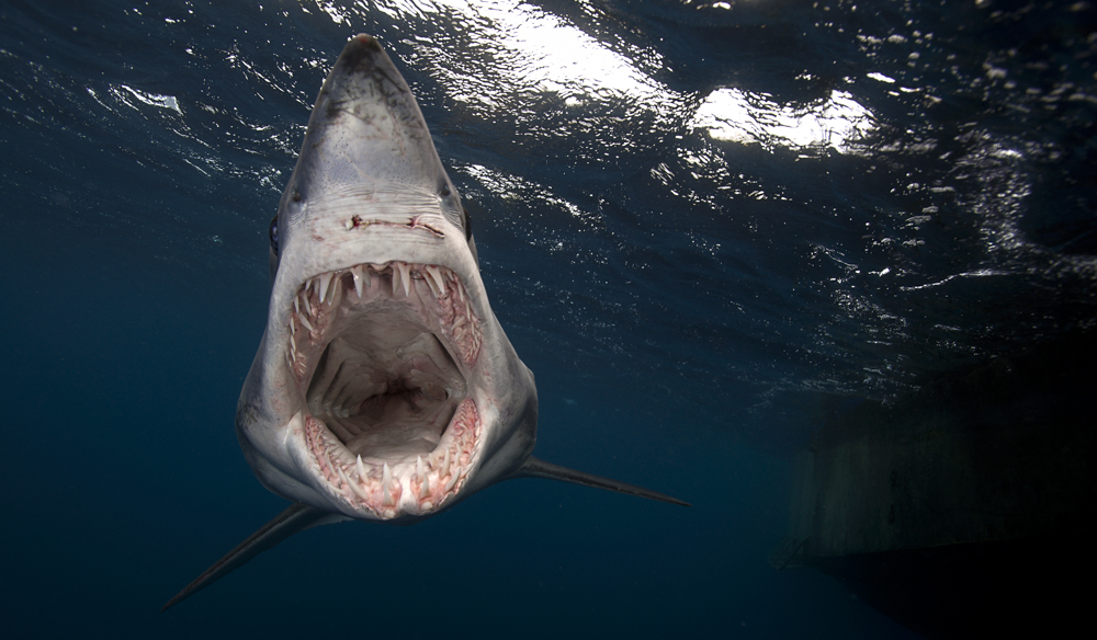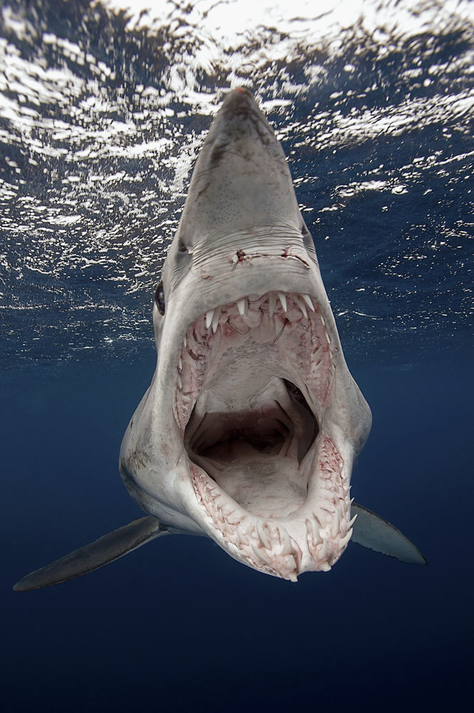 The Great Southern Ocean off South Australia is home to great biodiversity including the Isurus oxyrinchus, Shortfin Mako shark. This beautiful 3m female gapes to make herself look bigger and more menacing. Deep wounds are visible on her top lip from a recent seal encounter. Her open maw shows a multitude of parasitic copepods (Anthosoma crissum) burrowed into the soft tissue in the roof of her mouth. Playful and Charismatic she pouts and plays for the camera like an underwater 'Paris' Hilton. IUCN Red List – VU Vulnerable