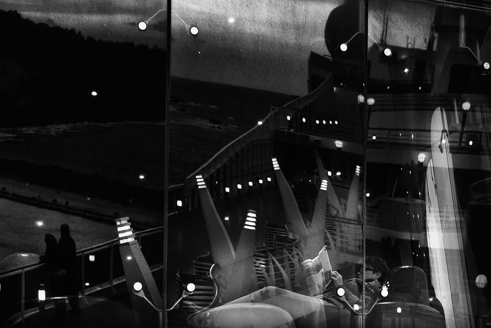"... Through my shadow projected on the bulkheads, through my profile drawn in the light, through my silhouette repeated in a endless mirror game, I tell you my story, which is the story of a thousand, an hundred thousand people. I become one body in the apparent chaos of a cruise ship, big beast to which, although for a short time, I belong."