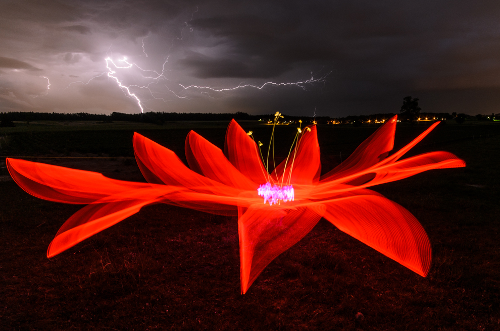 One single exposure (151 secs), out of the camera. Only cropping and tones corrected. Done with a LED-Strip and torches, swinging in the form of the flower, and waiting for the lightning at the right position. It tooks about 10 pictures, until i've got it.