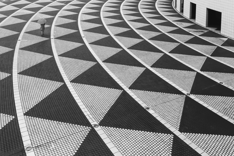 In international port terminal it is usually crowded with people, In the light rain, a young woman who was holding an umbrella of geometric patterns are walking one of the terrace of the geometric pattern. Utilizing a homogeneous beam of light by the texture and cloudy weather of the floor that was wet in the rain.