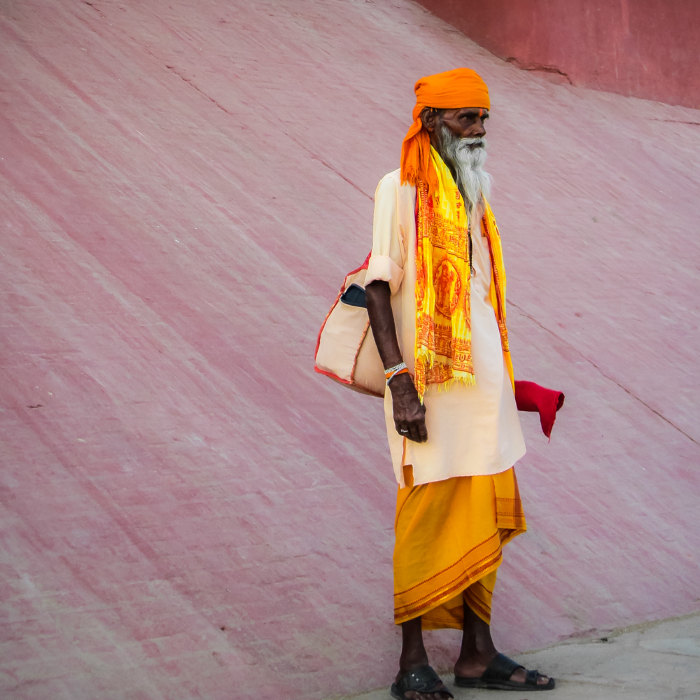 A Hindu holyman (sadhu) stares into the Ganga River from one of Varanasi's many ghats.
