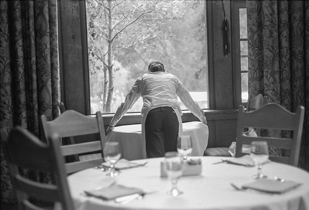 sixteen-foot-tall windows, a member of the wait staff crossed in front of me, obstructing my view. With one clean, crisp motion, she threw a tablecloth into the air and neatly laid it flat. She then proceeded to painstakingly iron out the creases with her hands. I could feel the care being transferred to the next guest. It was lovely. I reached for my camera and took a shot. Although views of Half Dome and Yosemite Falls were mere steps away, my preference was to