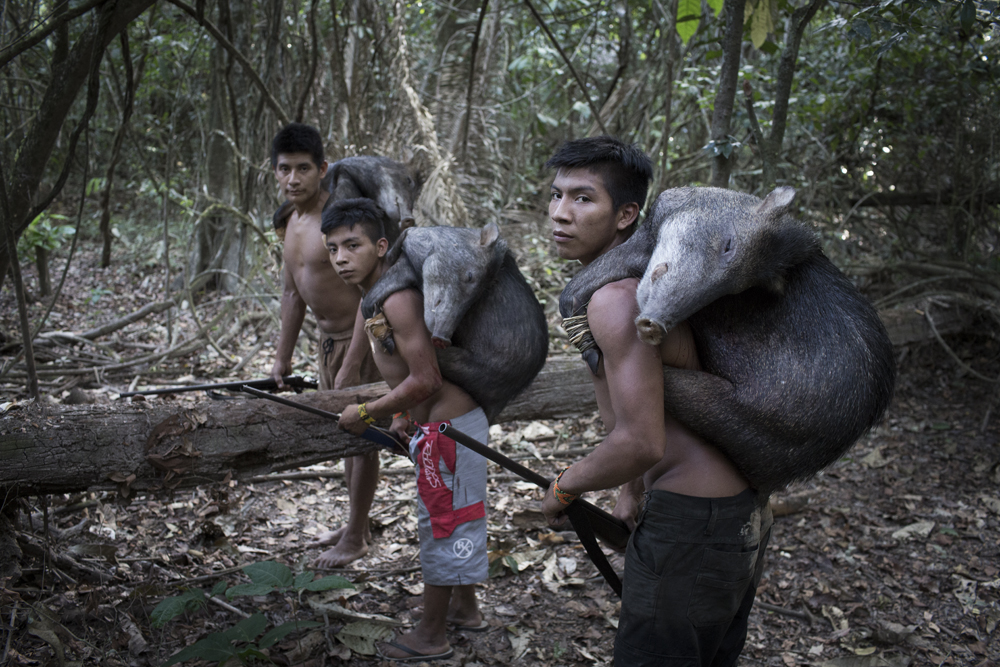 The Awa- guaja is the last nomad tribe that is been discovered on the Brazilian amazon.To escape the unwelcome intrusions of European explorers, according to the anthropologist, in the 1800’s the Awa-Guaja left their settlements and became a nomadic tribe. It is estimated that this hunter-gatherer tribe numbers are no more than 300 individuals. Many of the Awa-Guaja are brutally massacres by the ranchers and loggers. Awas carring three javalis. The hunted food will be share with the all tribe.